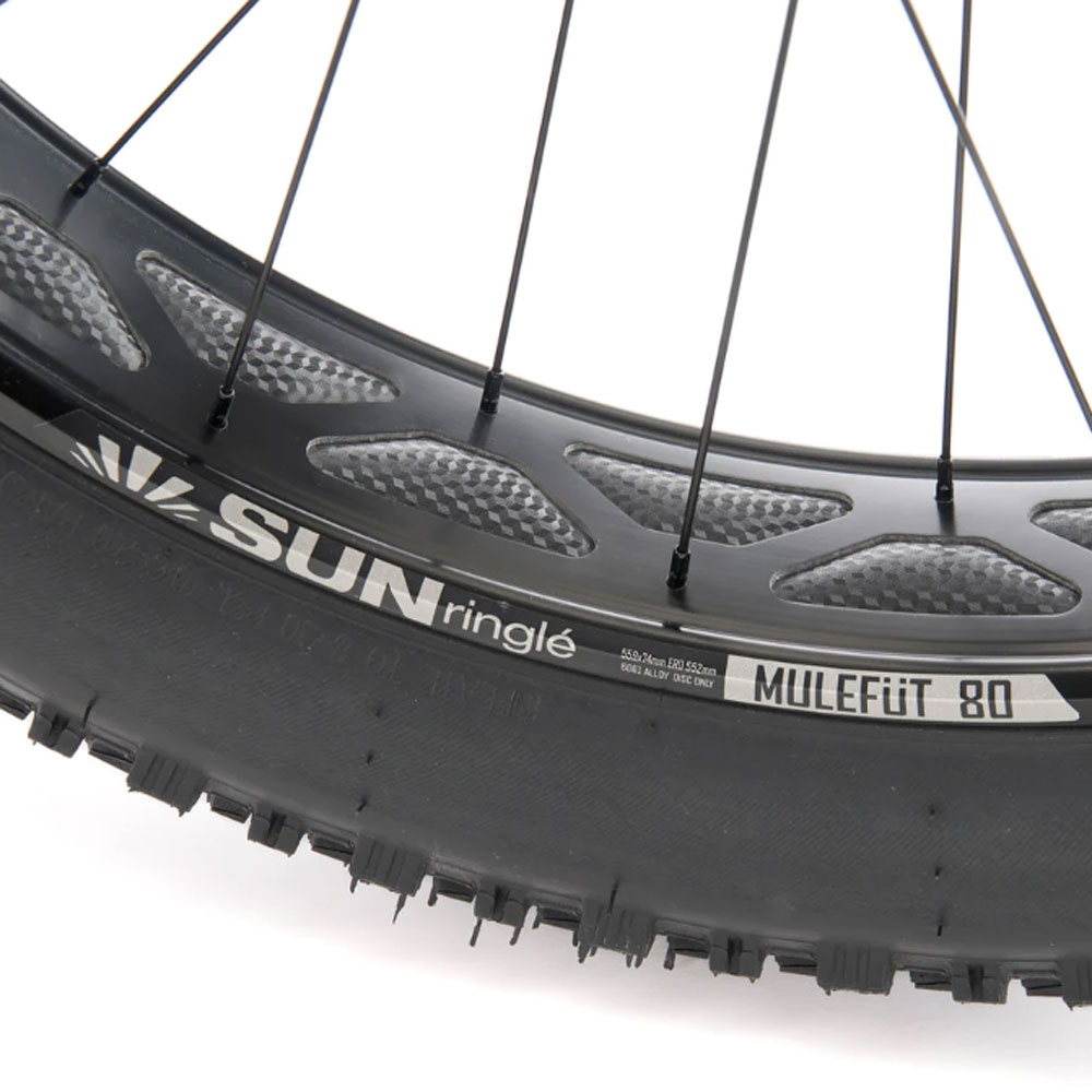 - Rear Wheel: KT 197x12mm Hub, Sun Ringle Mulefut 80 Tubeless Ready Rim